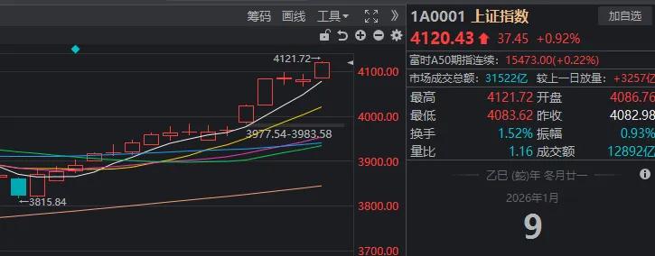 1月9日,市场震荡拉升,沪指高开高走突破4100点,深成指涨超1%。截至收盘,沪指涨0.92%,深成指涨1.15%,创业板指涨0.77%。