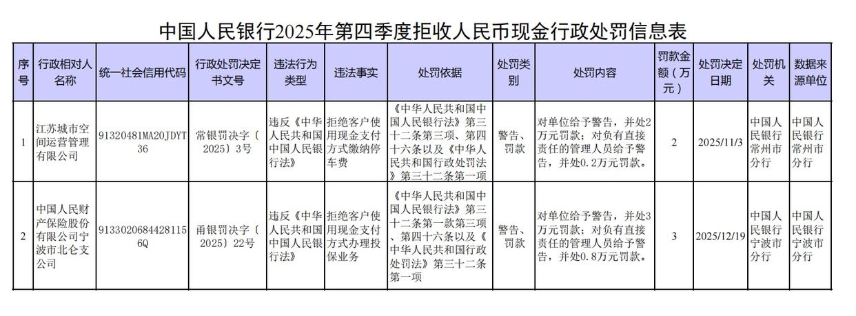 2025年第四季度,中国人民银行对2家核实为拒收人民币现金的单位及相关责任人依法作出经济处罚。广大经营主体应强化法治观念,尊重公众支付选择权,共同打造和谐现金流通环境。