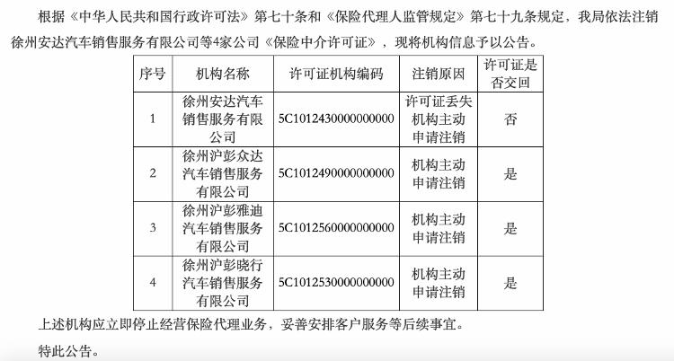 据界面新闻记者不完全统计,截止到2月2日,今年已有至少8家汽车销售服务公司正式注销保险中介牌照,退出保险代理与销售领域。比如,1月底江苏金融监管局依法注销徐州安达汽车销售服务有限公司等4家公司《保险中介许可证》。