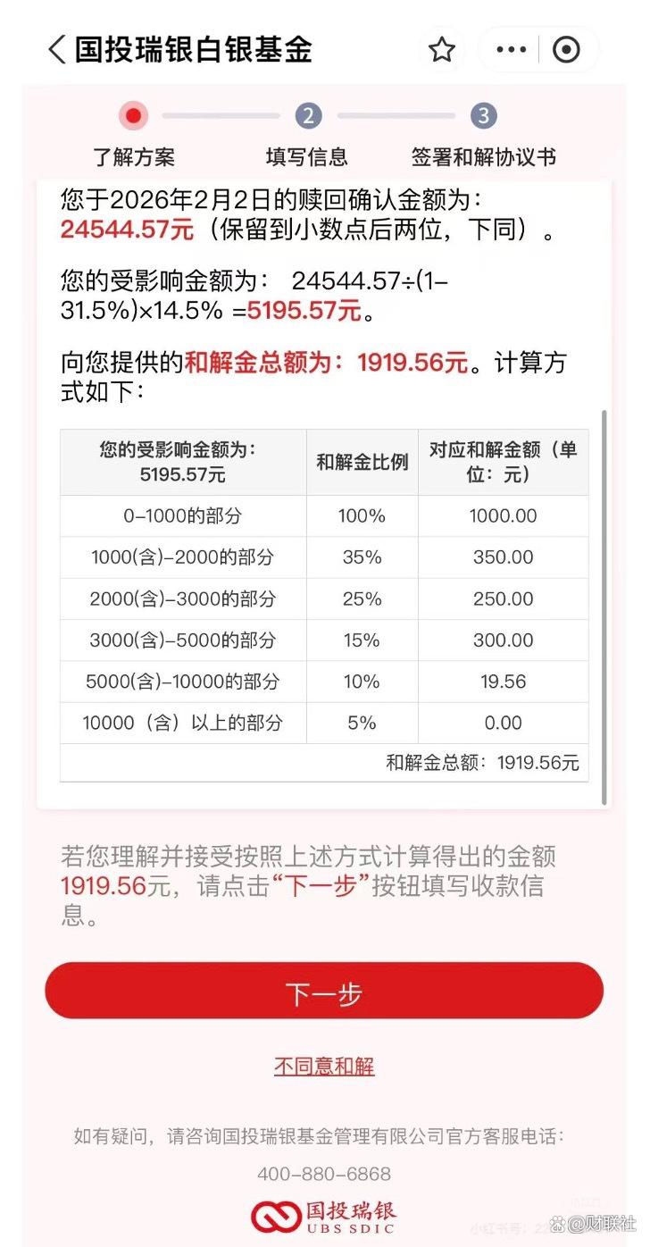 国投瑞银预计,超九成比例的自然人投资者受影响的部分能够获得全额处理,对于其余自然人投资者,方案也尽最大可能做出了相当比例的安排。关注二:超额累退如何具体计算?为方便投资者办理,国投瑞银联合支付宝推出了“国投瑞银白银基金”小程序,投资者可通过以下三步完成在线申请:首先,打开支付宝,搜索“国投瑞银白银基金”小程序,再根据提示完成实名认证,系统将自动识别投资者是否符合补偿范围。核验通过后,页面将显示预估的受影响金额与可申请的和解金额。最后,投资者核对信息无误后,点击确认并提交申请。系统将自动生成和解协议,投资者在线签署后,和解金将在规定时间内划付至原赎回账户。投资者可以按照统一的超额累退机制获得自身的和解金额。具体计算分为两个阶段:一是还原投资者受影响金额;二是分段计算出最终的和解金总和。受影响金额等于赎回确认金额÷(1-31.5%)×14.5%,其中,14.5%为由-17%调至-31.5%的比例差额。该公式的核心逻辑是通过赎回确认金额“还原”投资者持仓,再乘以估值调整的差额比例(14.5%),得出实际受影响金额。