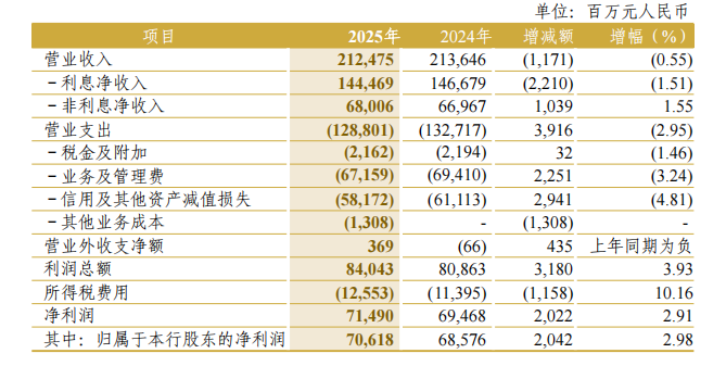 年报数据显示,截至2025年末,中信银行总资产达到10.13万亿元,较上年末增长6.28%,成功跨越十万亿大关。盈利能力方面,报告期内实现归属于股东净利润706.18亿元,同比增长2.98%,首次突破700亿元;实现营业收入2124.75亿元,虽同比微降0.55%,但非利息净收入占比提升至32.0%,收入结构持续优化。