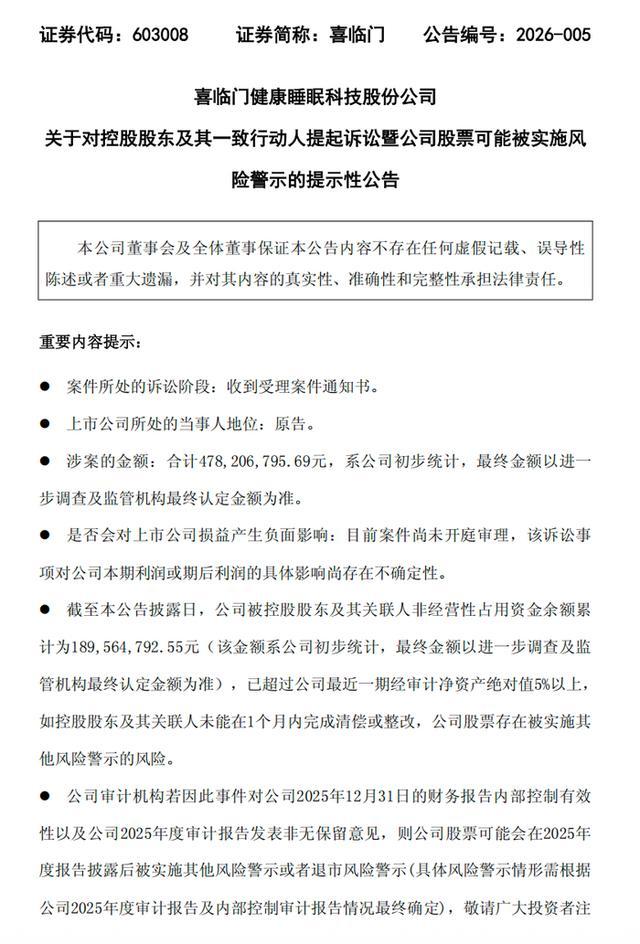 喜临门面临的风险已涉及监管调查、资金占用清偿及年度审计等多个方面。证监会调查结果尚未明确,相关资金占用问题仍在整改过程中,而2025年度审计报告的意见类型,将对公司后续风险状态产生重要影响。